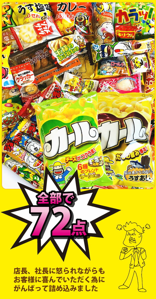セット内容 たっぷり70点! + 明治 カール チーズ味 1袋(64g) 明治 カール うすあじ 1袋(68g) 画像にある商品はイメージですので入らない商品がある場合がございますので予めご了承下さいませ。